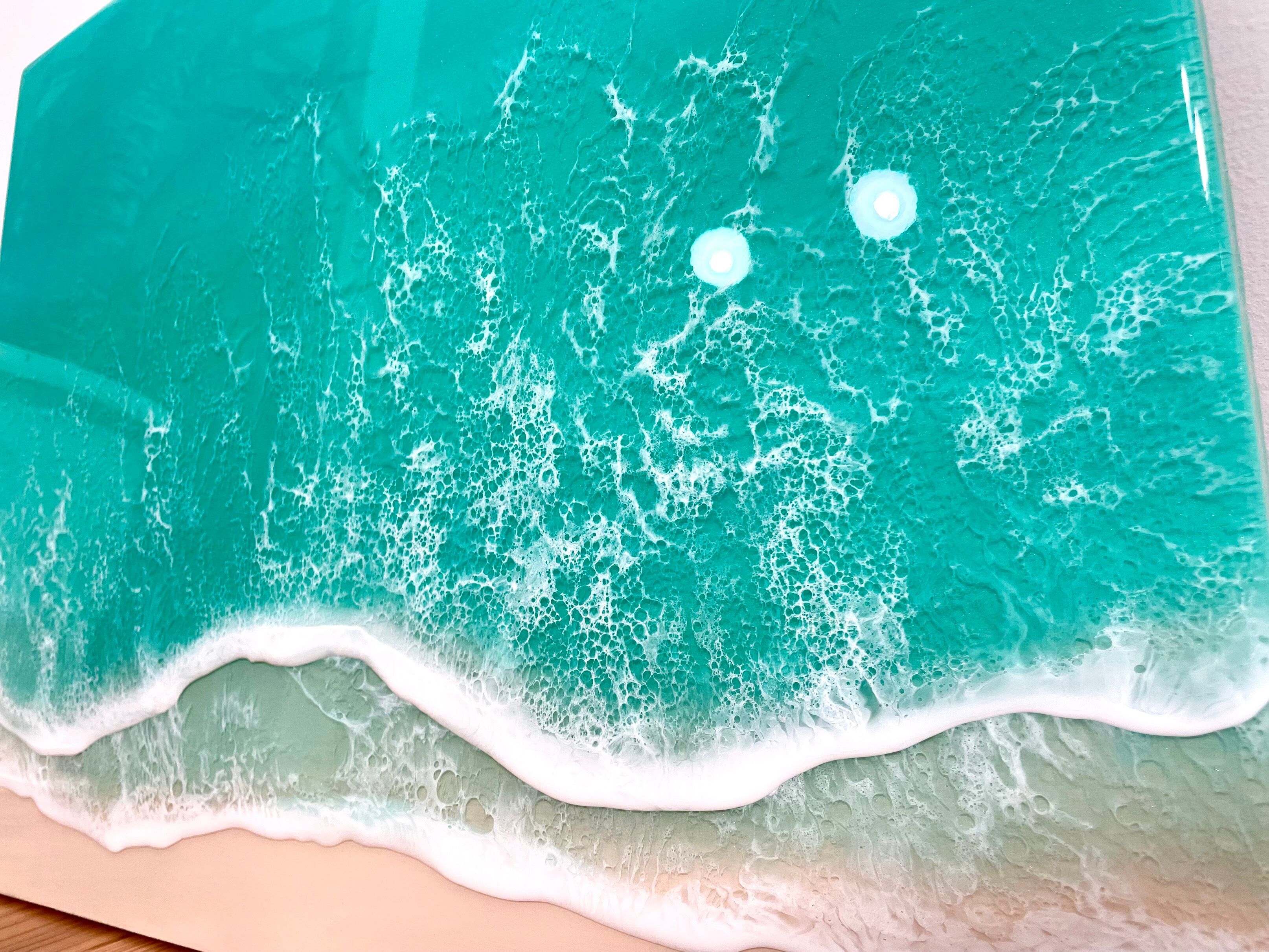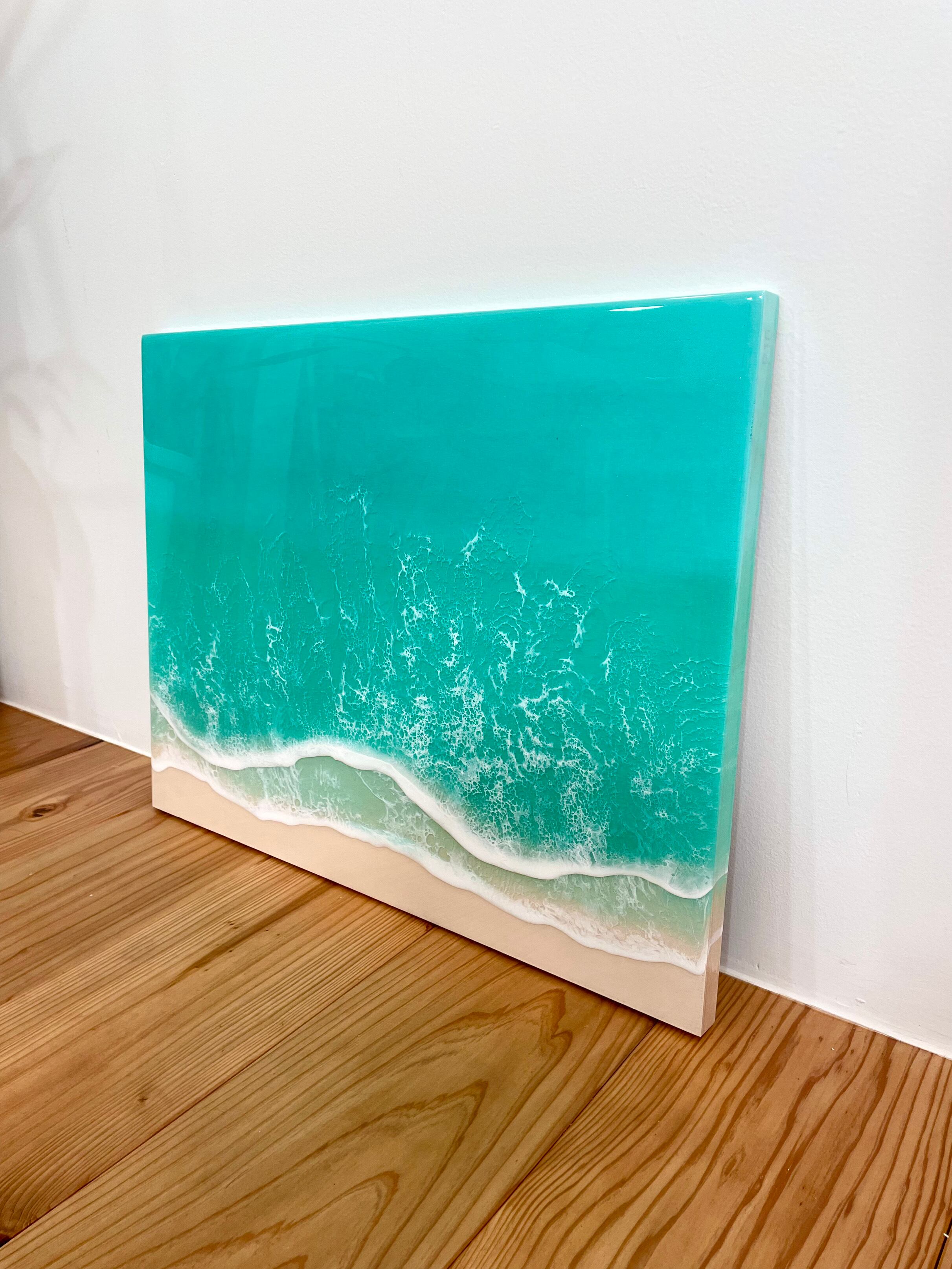 砂浜もオールレジンで艶やかに仕上げ、綺麗な波を再現できた立体的なアートです。