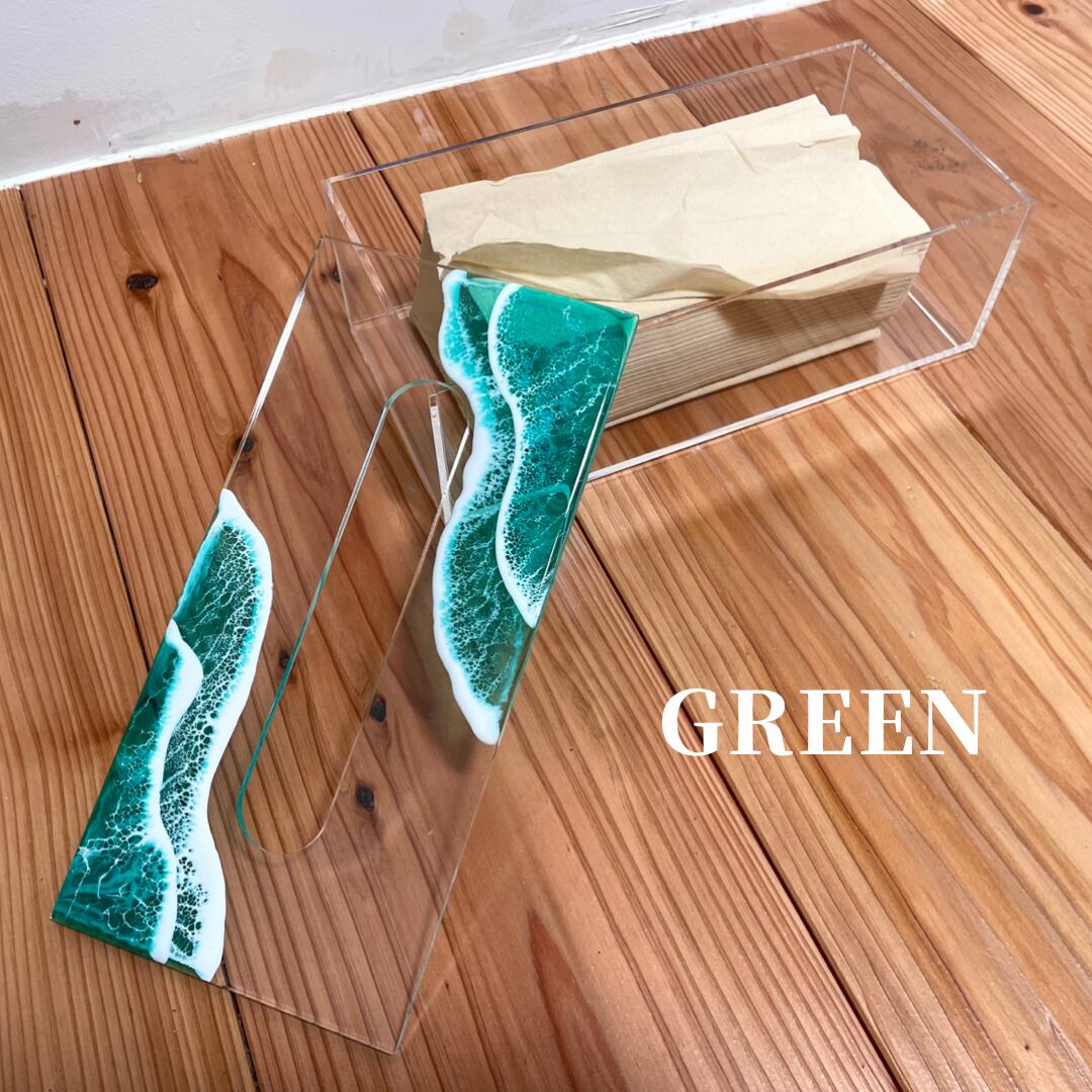 アクリル製のティッシュケースの天板部分に計4層の波を作成したレジン雑貨となります。